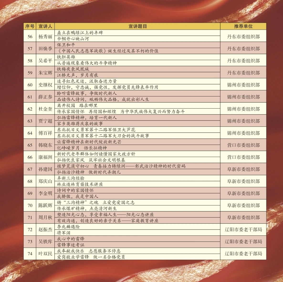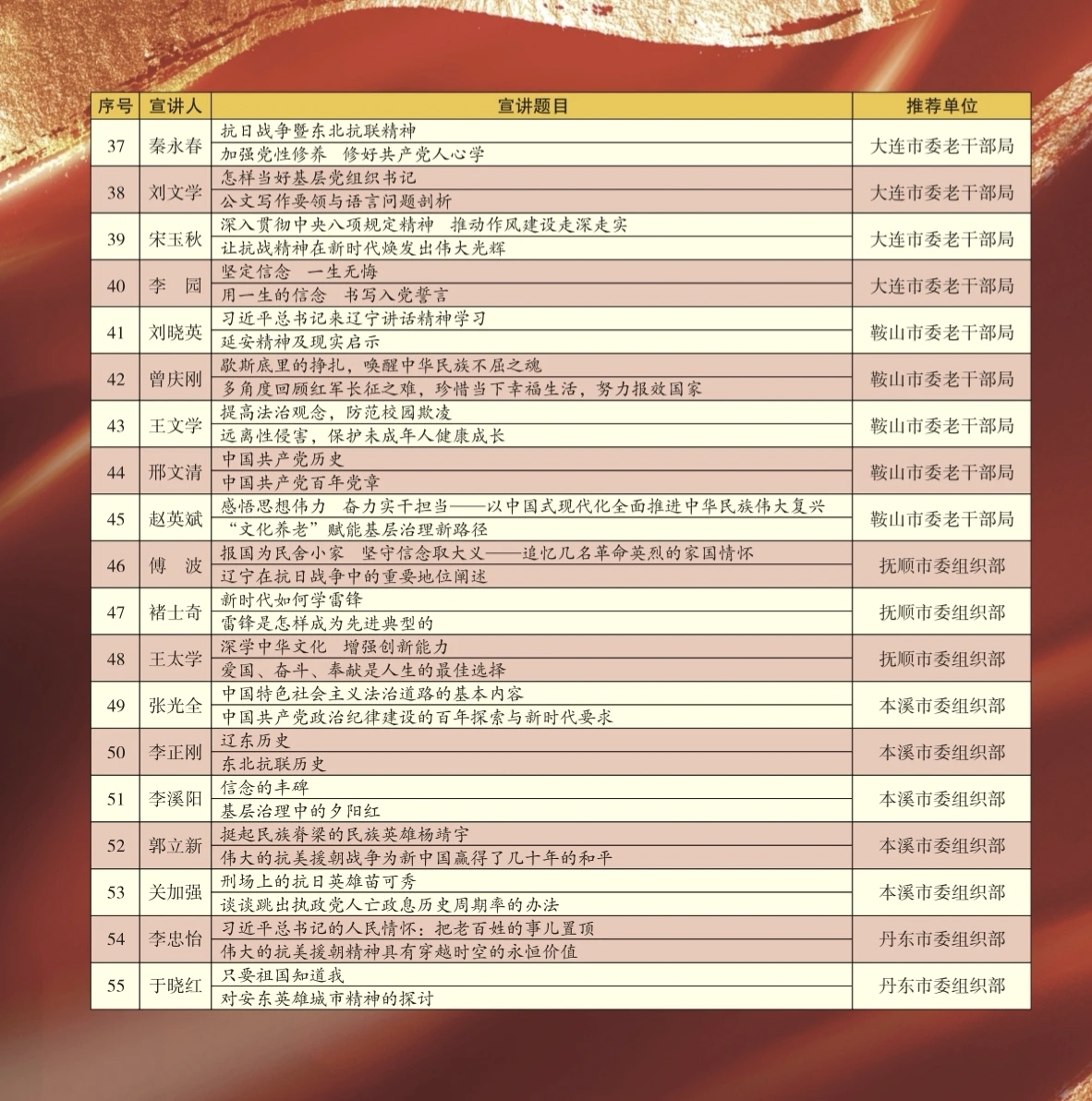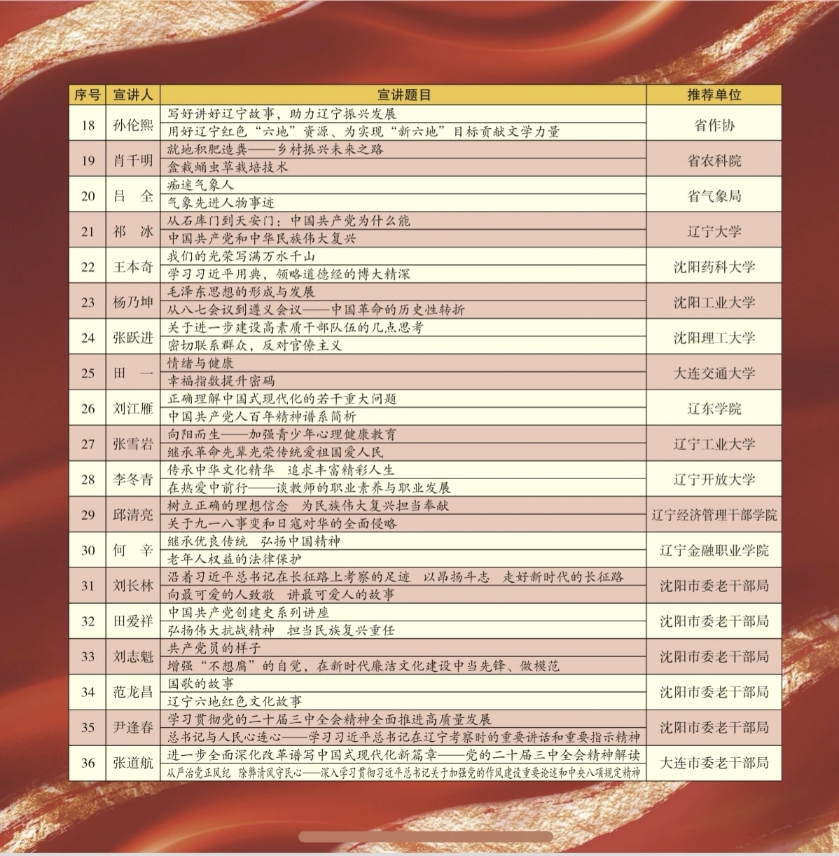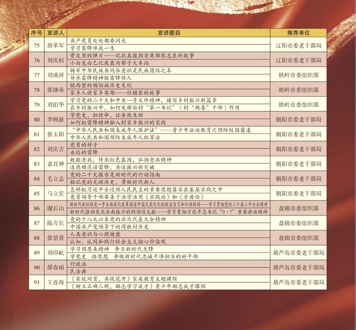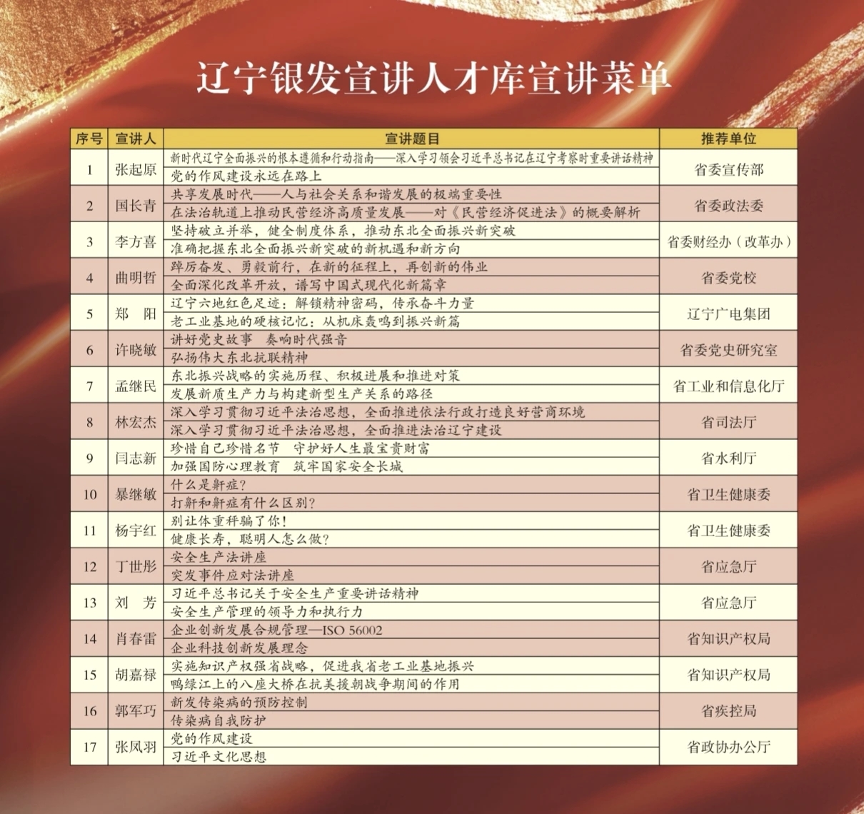 为深入学习贯彻习近平总书记给“银龄行动”老年志愿者代表和上海市杨浦区“老杨树宣讲汇”全体同志的重要回信精神,充分发挥离退休干部政治优势、经验优势和威望优势,打造一支政治坚定、理论扎实、专业突出的银发宣讲队伍,辽宁省委老干部局在全省范围内选取91位热爱宣讲、擅长宣讲的老同志,正式组建辽宁银发宣讲人才库。根据每位入库老同志擅长的宣讲领域,制作涵盖党的创新理论、政策解读、革命故事、文化传承、法律法规、医疗健康、家庭教育等内容的“宣讲菜单”,为全省各地各部门各单位提供“点单式”宣讲服务,欢迎各单位点单约课。