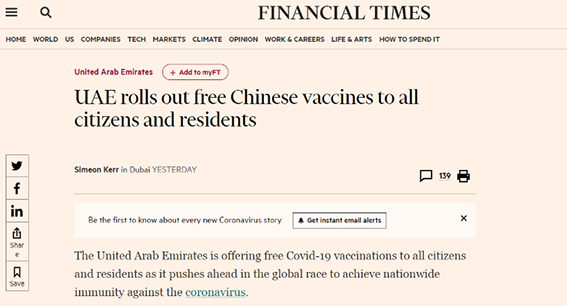 据英国《金融时报》12月22日报道,中国国药控股研发的新冠疫苗本月初获得阿联酋官方正式注册,目前阿联酋政府已将疫苗接种范围扩大至全国所有成年人群。 报道称,阿联酋公立和私立诊所以及野战医院,都可以免费接种中国国药集团生产的新冠疫苗。9月份,阿联酋批准一线医务人员紧急使用中国产新冠疫苗。现在,又将疫苗接种范围扩大至全国所有成年人群,包括100万本国居民和超800万居住在阿联酋的外国居民。 在迪拜经营宠物用品公司Hanz & Oley的英国侨民特瑞娜·莫尔说:“迪拜这家医院棒极了,比英国大多数医院都好。”“气氛很好,真的很友好。我本来以为会很紧张,但也许每个人都感到一些宽慰,因为我们终于找到了解决这场流行病的方法。” 阿联酋政府表示,对国药集团新冠疫苗Ⅲ期临床试验的分析表明,该灭活疫苗对抗新冠病毒感染的有效率为86%。在阿联酋生活、来自125个国家和地区的31000多名志愿者参加了疫苗临床试验。