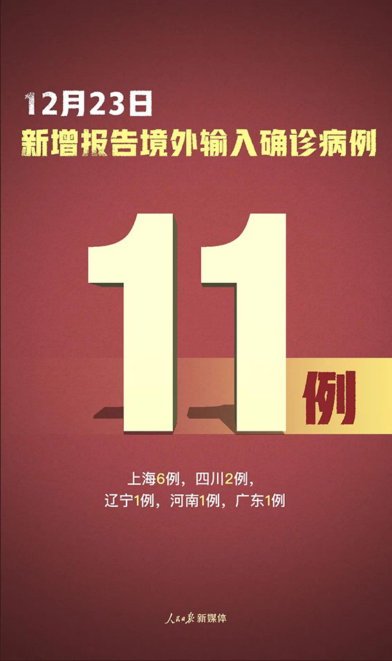 12月23日0—24时,31个省(自治区、直辖市)和新疆生产建设兵团报告新增确诊病例17例,其中境外输入病例11例(上海6例,四川2例,辽宁1例,河南1例,广东1例),本土病例6例(均在辽宁);无新增死亡病例;无新增疑似病例。