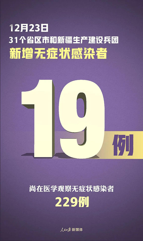 当日新增治愈出院病例22例,解除医学观察的密切接触者669人,重症病例较前一日增加1例。 境外输入现有确诊病例274例(其中重症病例5例),无现有疑似病例。累计确诊病例4174例,累计治愈出院病例3900例,无死亡病例。 截至12月23日24时,据31个省(自治区、直辖市)和新疆生产建设兵团报告,现有确诊病例315例(其中重症病例6例),累计治愈出院病例81950例,累计死亡病例4634例,累计报告确诊病例86899例,无现有疑似病例。累计追踪到密切接触者894409人,尚在医学观察的密切接触者7488人。 31个省(自治区、直辖市)和新疆生产建设兵团报告新增无症状感染者19例(境外输入14例);当日转为确诊病例6例(境外输入3例);当日解除医学观察3例(均为境外输入);尚在医学观察无症状感染者229例(境外输入187例)。