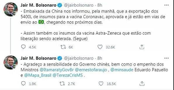 路透社1月26日报道称,巴西总统博索纳罗于25日在推特账号上连发两条推文,感谢中国快速批准并向巴西出口科兴疫苗的活性成分。