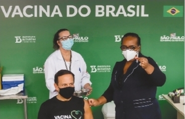 5月7日,巴西圣保罗州州长若昂·多利亚(下)在圣保罗市一个疫苗接种点接种克尔来福新冠疫苗。为其接种疫苗的护士莫妮卡·卡拉桑斯(右)于今年1月17日接种了克尔来福疫苗,是巴西首个接种新冠疫苗的人。克尔来福新冠疫苗由北京科兴中维生物技术有限公司研制。