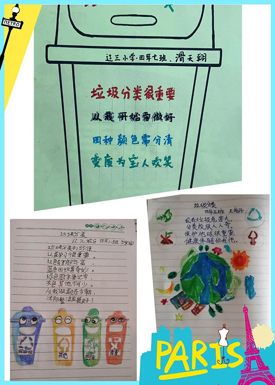孩子们和家长一同制作,小小手抄报把分类宣传带入家庭。小手拉大手,共同宣传、学习垃圾分类相关知识,提高垃圾分类意识,全家总动员积极参与到垃圾分类活动中。学生们自主创编垃圾分类儿歌,短小、易懂,朗朗上口,辽三小学赵翔老师帮助学生对儿歌作品精雕细雕琢,诗歌作品韵味十足。有的孩子精心设计了“垃圾分类口号”,倡导动员更多的人参与垃圾分类。每一次垃圾分类答题,辽三小学教育集团的全体师生都积极参与,并带动家长共同参与。“小手拉大手”共同学习垃圾分类知识,进一步掌握沈阳市垃圾分类的具体方法与措施,熟悉生活垃圾的具体分类,指导个人、家庭正确的进行生活垃圾分类,养成环保生活、倡导分类的生活模式。辽三小学教育集团积极践行垃圾分类新理念,大力推行垃圾分类工作,在学校继续加大宣传力度,积极引导全校师生把垃圾分类工作融入班级管理、学校卫生评比中,人人争当垃圾分类宣传员,人人学会垃圾分类,让垃圾分类环保意识融入生活的每一天,为创建绿色生存环境尽自己的一份力量。