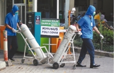 7月4日,在印度尼西亚日惹的一家医院,医务人员运送为新冠患者提供的氧气罐。据印度尼西亚国家抗灾署4日发布的新冠疫情数据,该国较前一日新增新冠确诊病例27233例,这是该数值连续三天超过2.5万例。