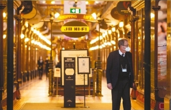 上图:7月5日,澳大利亚悉尼市中心的街道上空空荡荡。下图:7月5日,一名男子戴着口罩站在澳大利亚悉尼市中心的一家商场门口。由于本地传播病例持续出现,澳大利亚第一大城市悉尼持续保持“封城”状态。新华社发