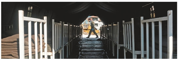 7月3日,一名士兵走过在塞尔维亚新帕扎尔建造的临时医院。塞尔维亚新冠疫情近期有所反弹,连续多日新增确诊病例超过200例。