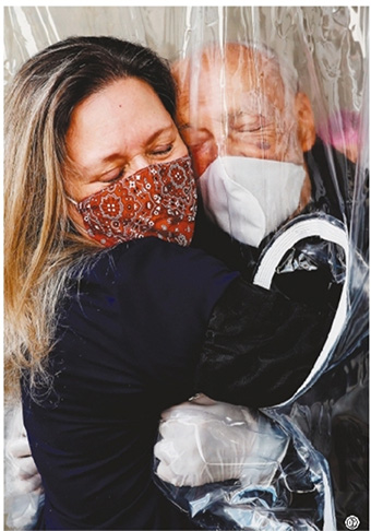 7月2日,在巴西圣保罗的一家老人院,一名前来探视的女子隔着塑料帘拥抱自己的父亲。 据巴西卫生部3日下午公布的疫情数据,巴西24小时内新增新冠确诊病例42223例,累计确诊1539081例;新增死亡病例1290例,累计死亡63174例。