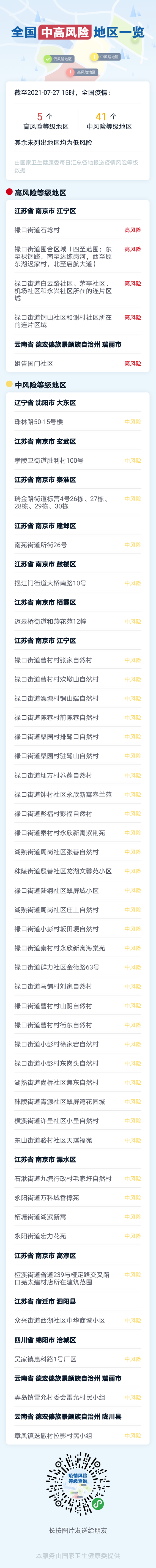 最新!全国现有高风险地区5个,中风险地区41个!