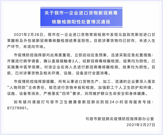 2月27日,江苏省句容市新冠肺炎疫情防控指挥部办公室发布通报称,2月26日,句容市一企业进口货物常规检测中,发现乌兹别克斯坦进口甘草酸粉及外包装新冠病毒核酸检测结果呈阳性。目前涉事货物均已封存,未进入生产环节,未流向市场。 通报称,开展流行病学调查,确认直接接触者2人,经新冠病毒核酸检测,结果均为阴性,已实施集中医学观察。对该企业在岗人员进行新冠病毒核酸检测,结果均为阴性。目前,已对涉事货物及相关环境、设施、设备进行全面消毒。