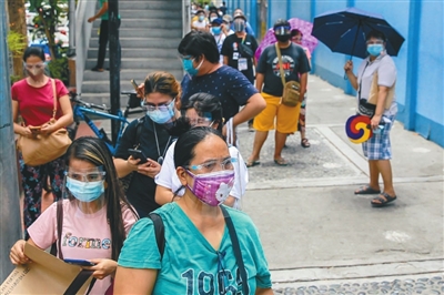 3月31日,人们在菲律宾马尼拉排队等待接种中国科兴新冠疫苗。菲律宾政府采购的首批中国科兴新冠疫苗29日运抵马尼拉。