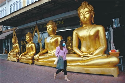 1月5日,一名戴口罩的女子经过泰国曼谷街头的佛像。