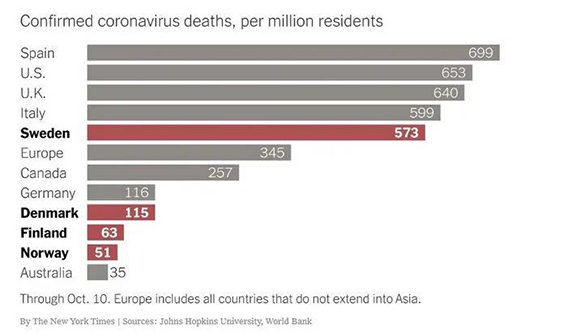 瑞典电视台报道,瑞典公共卫生局新闻发布会表示,现在瑞典患病年龄群体是20至50岁年龄组,而老年群体不是感染的主要对象。瑞典百万居民新冠病毒死亡率。图片来源:《纽约时报》据约翰·霍普金斯大学数据卫生局的Bitte Bråstad 宣布,当局决定暂时收紧地区一般性建议。此政策将于10月19日生效。卫生局与感染控制医生协商后决定可以采取的措施。例如,将能够决定民众是否要避免使用公共交通工具;避免拜访老人院;避免去购物中心;避免在室内环境聚集;避免去餐馆或与您不熟知的人有身体接触。这些都是临时措施,可以先试用两周,之后再进行延长。如果发生疫情暴发,这是一个减少病毒感染传播的措施。据美国《纽约时报》10月8日的报道,瑞典的死亡病例中近45%为居住在疗养院中的老年人口。《科学》杂志网站10月6日的一篇报道称,瑞典首都斯德哥尔摩的养老院共住有1.4万多名老人,其中7%的人最终死于新冠,而绝大多数并没有被送入医院接受治疗。据《纽约时报》报道,瑞典是全球税收最高的国家之一,而政府则为公民提供各种服务,包括医疗保健、教育、失业现金援助等。可是,此次新冠疫情暴露了瑞典福利国家制度中的漏洞——数十年的预算削减和市场化改革,直接导致瑞典养老院中的“死亡浪潮”。报道指出,为节约开销,养老院大多依赖于没有接受过正规医学和老年护理培训的兼职工和临时工。一些无用工合同、拿着最低工资的临时工即使在生病之后任会继续轮班,因为政府提供的病假工资不能弥补其工资的损失。这加剧了疫情在养老院内的传播。另一方面,瑞典在过去20年中大幅减少了医院的容纳能力。在疫情最初暴发的严重时期,由于医院担心不堪重负,养老院的老人们被拒绝接纳治疗。斯德哥尔摩发布的疫情指南甚至鼓励医生对患者进行姑息护理 ,即放弃拯救患者的生命,而是使患者尽可能舒适地度过生命最后的时光。面对全球肆虐的新冠疫情,瑞典的应对方式也与许多国家大相径庭。据《科学》杂志报道,瑞典政府从未采取任何“封锁”(lockdown)措施,也没有下令禁止日托中心和小学开放。当全球各地采取了不同程度的公共场合禁令与提倡保持社交距离时,瑞典人还在咖啡馆里聊天,在健身房里锻炼。据多家媒体报道,瑞典当局甚至积极劝阻人们不要佩戴口罩,称这会引起恐慌,人们可能错误佩戴,而且会给人以错误的安全感。一些坚持在工作中佩戴口罩的医务人员遭到斥责甚至被开除。10月12日,世界卫生组织总干事谭德塞日表示,通过所谓“群体免疫”应对新冠疫情的说法在科学和伦理上都存在问题。:“群体免疫是通过保护人们不受病毒感染而实现的,而不是通过让他们暴露于病毒中。”“在公共卫生史上,群体免疫从未被用作为应对疫情暴发的一种策略,更不用说应对大流行病了。这从科学和伦理上来讲都是有问题的。”他说道。