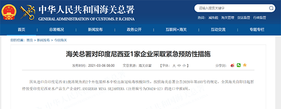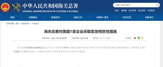 据海关总署消息,因从美国WAYNE FARMS,LLC生产企业(注册号为P445)的1批次输华冻珍珠宝鸡爪产品外包装中检出新冠病毒核酸阳性,按照海关总署公告2020年第103号的规定,全国海关自即日起暂停接受该企业产品进口申报1周。据海关总署消息,因从进口自印度尼西亚1批冻鱿鱼的2个外包装样本中检出新冠病毒核酸阳性,按照海关总署公告2020年第103号的规定,全国海关自即日起暂停接受印度尼西亚水产品生产企业PT.ANUGERAH MINA SEJAHTERA(注册编号为CR424-12)的进口申报4周。
