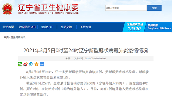 3月5日0时至24时,辽宁省无新增新冠肺炎确诊病例,无新增无症状感染者。新增境外输入无症状感染者治愈出院1例。截至3月5日24时,全省累计报告确诊病例406例(含境外输入95例),治愈出院402例,死亡2例,在院治疗2例(均为境外输入)。目前,尚有1例境外输入无症状感染者在定点医院隔离治疗。