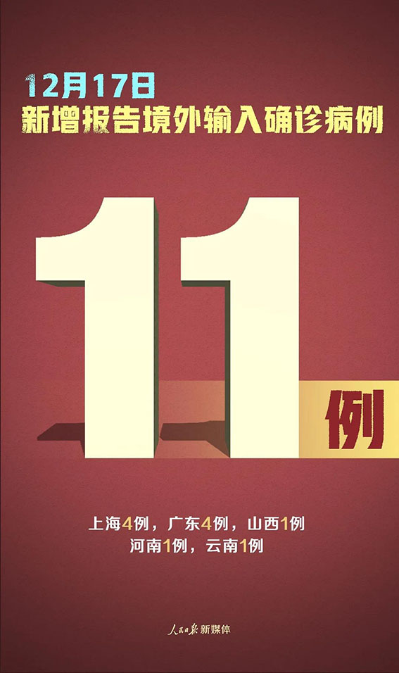 12月17日0—24时,31个省(自治区、直辖市)和新疆生产建设兵团报告新增确诊病例12例,其中境外输入病例11例(上海4例,广东4例,山西1例,河南1例,云南1例),本土病例1例(在四川);无新增死亡病例;无新增疑似病例。