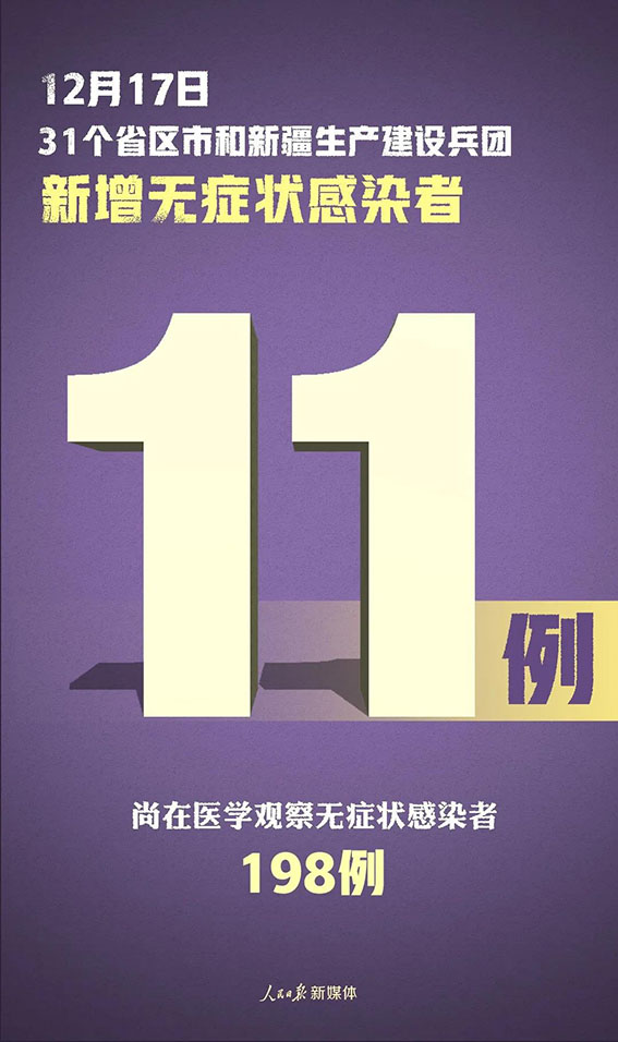 当日新增治愈出院病例9例,解除医学观察的密切接触者494人,重症病例较前一日增加1例。境外输入现有确诊病例262例(其中重症病例6例),现有疑似病例3例。累计确诊病例4079例,累计治愈出院病例3817例,无死亡病例。截至12月17日24时,据31个省(自治区、直辖市)和新疆生产建设兵团报告,现有确诊病例304例(其中重症病例8例),累计治愈出院病例81851例,累计死亡病例4634例,累计报告确诊病例86789例,现有疑似病例4例。累计追踪到密切接触者890102人,尚在医学观察的密切接触者7014人。31个省(自治区、直辖市)和新疆生产建设兵团报告新增无症状感染者11例(境外输入9例);当日转为确诊病例1例(为境外输入);当日解除医学观察10例(境外输入9例);尚在医学观察无症状感染者198例(境外输入178例)。