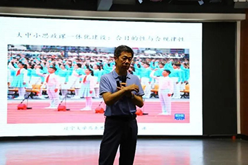 为深入学习贯彻习近平总书记在学校思想政治理论课教师座谈会上的重要讲话精神,充分发挥沈阳市教育局与辽宁大学共建大中小学思政课一体化基地作用,7月19日,沈北新区大中小思政课一体化建设报告会在辽宁大学附属实验学校举行。全区中小学思政课教师、教育局负责同志共计200余人参加会议。 会议特邀辽宁大学马克思主义学院祁冰教授以“思政一体化建设”为题做报告。祁冰围绕“大中小思政课一体化建设”,从意识形态角度剖析了大中小思政课一体化的必要性,从现实的视角分析了大中小思政课一体化建设的问题,在科学的判断下把握大中小思政课一体化建设的规律,从而提出守正创新、锐意进取的前景和目标。报告让全区思政课教师更加认识到大中小思政课一体化的必要性和可行性,加强了教师的紧迫感和使命感。