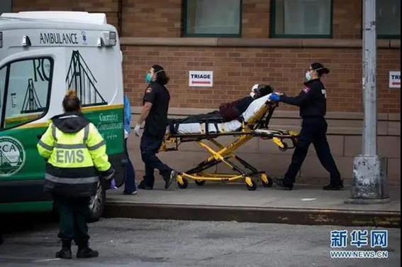 4月19日,在美国纽约一家医院,医护人员运送病人。新华社发(郭克 摄)