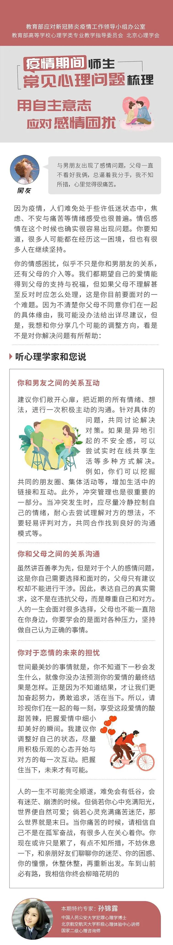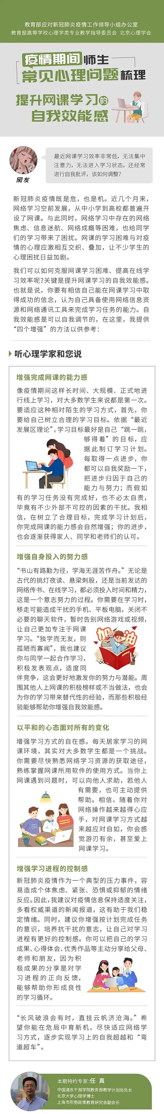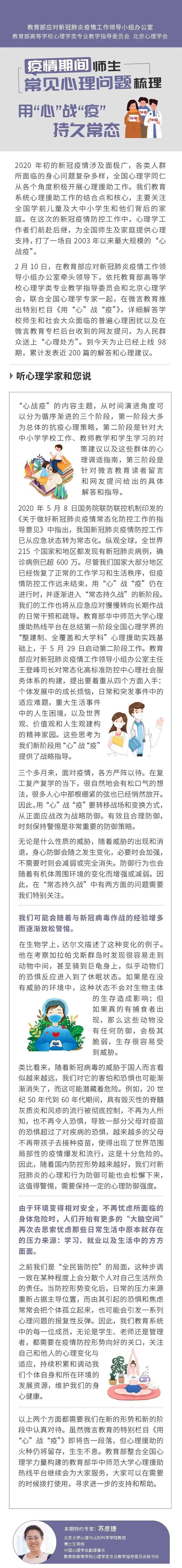 疫情防控常态化,师生如何调整身心状态?怎样提升网课学习效率?听心理学专家解答 | 用“心”战“疫”(98)疫情当下,关于心理方面你有什么想问的问题吗?欢迎大家拨打教育部华中师范大学心理援助热线:4009678920、010-67440033、027-59427263,或微信留言,我们将邀请专家为你解答! 今天,推出《用“心”战“疫”》第(98)期,随教育小微一起来听北京大学心理与认知科学学院教授苏彦捷、北京航空航天大学积极心理体验中心讲师孙锦露、中国浦东干部学院教务部教学计划处处长任真详解,疫情期间常见心理问题如何调整↓↓↓