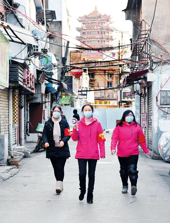 2020年2月16日,武汉市武昌区中华路街道西城壕社区党委书记翁文静(中)带领志愿者上街进行疫情防控宣讲。图为她们正在辖区宣讲。湖北日报全媒记者 周立新/摄 “关键时刻,我们要当群众的主心骨!”黄恒,武汉洪山区珞南街党政办公室工作人员。因洪珞社区工作人员病倒了,临危受命担任社区“临时书记”的他,日夜奔忙,突发腰椎间盘突出,疼痛难忍时,就躺在办公室地板上安排工作,只因放不下社区9000多位居民。 “没有生而勇敢,只能选择坚强。”“千难万难,干就不难!”张胜林,武汉市江汉区万松街航侧社区党委委员。坚守协和医院发热门诊、方舱医院,全天候服务居民就医。一枚党徽、一套防护服、一板咽含片就是他一天的装备。有居民说,“去医院看到他,就不害怕了”。