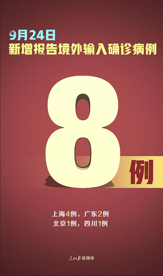 9月24日0—24时,31个省(自治区、直辖市)和新疆生产建设兵团报告新增确诊病例8例,均为境外输入病例(上海4例,广东2例,北京1例,四川1例);无新增死亡病例;新增疑似病例1例,为境外输入病例(在上海)。