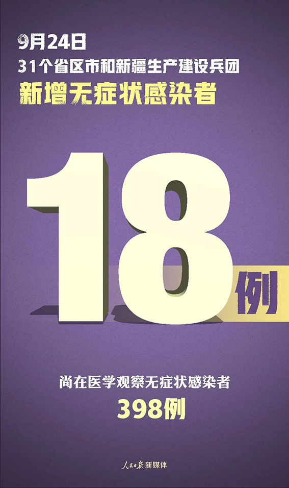 31个省(自治区、直辖市)和新疆生产建设兵团报告新增无症状感染者18例(境外输入16例);当日转为确诊病例1例(为境外输入);当日解除医学观察21例(均为境外输入);尚在医学观察无症状感染者398例(境外输入396例)。