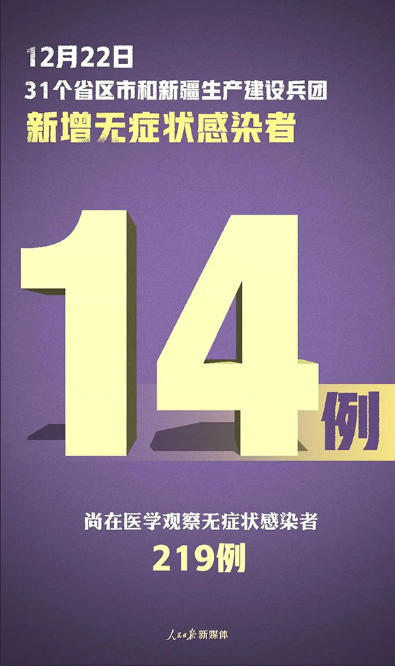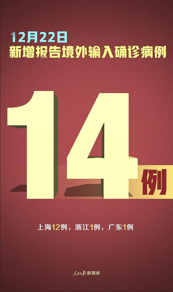 12月22日0—24时,31个省(自治区、直辖市)和新疆生产建设兵团报告新增确诊病例15例,其中境外输入病例14例(上海12例,浙江1例,广东1例),本土病例1例(在辽宁);无新增死亡病例;无新增疑似病例。当日新增治愈出院病例19例,解除医学观察的密切接触者751人,重症病例较前一日增加1例。境外输入现有确诊病例280例(其中重症病例4例),无现有疑似病例。累计确诊病例4163例,累计治愈出院病例3883例,无死亡病例。截至12月22日24时,据31个省(自治区、直辖市)和新疆生产建设兵团报告,现有确诊病例320例(其中重症病例5例),累计治愈出院病例81928例,累计死亡病例4634例,累计报告确诊病例86882例,无现有疑似病例。累计追踪到密切接触者893870人,尚在医学观察的密切接触者7618人。31个省(自治区、直辖市)和新疆生产建设兵团报告新增无症状感染者14例(境外输入6例);当日转为确诊病例1例(为境外输入);当日解除医学观察8例(均为境外输入);尚在医学观察无症状感染者219例(境外输入179例)。