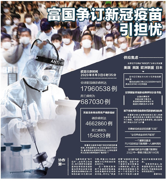 截至北京时间 2020年8月3日6时35分 全球新冠确诊病例达 17960538例 死亡病例为 687030例 美国是全球疫情最严重的国家 确诊病例达 4662860例 死亡病例为 154833例 随着发达国家争相订购在研新冠病毒疫苗,其他国家和公共卫生权益组织开始担忧,富国是否会垄断疫苗供应,让其他国家民众在排队接种疫苗时“靠后站”? 供应焦虑 总部位于伦敦的“有限空气”分析公司估算 美国 英国 欧洲联盟 日本 迄今已订购总计大约13亿剂备选新冠疫苗 潜在的加购订单以及正在谈判中的交易涉及另外约15亿剂疫苗 受到富国青睐的疫苗研制企业包括 法国的赛诺菲 英国的葛兰素史克 美国辉瑞制药有限公司 德国生物新技术公司等 眼下全球尚无确定安全有效的新冠疫苗 尽管部分药企的候选疫苗已进入终期实验阶段,要实现疫苗大规模应用仍需清除不少障碍。包括证明疫苗有效性、通过监管部门审批以及扩大产量 即便新冠疫苗研发前景“乐观” “全世界疫苗依然不够用” 一个重要因素是 不少在研疫苗可能需要一人接种两剂 全球新冠疫苗供应量可能要到 2022年一季度才能达到10亿剂 协作 第一 为避免疫苗“供不应求”,由世界卫生组织、流行病防范创新联盟和全球疫苗免疫联盟共同推动的联合国新冠疫苗保障机制6月制定总额180亿美元的方案,希望2021年底前确保20亿剂疫苗的供应和交付。 这一保障机制有助于各国政府抵御备选疫苗最终研发失败的风险,同时让“家底较薄”的国家负担得起疫苗供应。目前70多个国家已表示有意加入保障机制。另外,全球疫苗免疫联盟主导的一个项目致力于为90多个中低收入国家和经济体提供新冠疫苗。 但有官员指出,如果国家政府以自身利益为先,可能阻挠全球协同抗疫努力。 据新华社 |