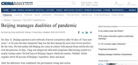 近日,英国格拉斯哥大学教授比斯瓦斯(Asit K. Biswas)和泰勒弗朗西斯出版集团中国区总裁洪颖源(Ang Eng Guan)在中国日报刊登署名文章,认为北京市政府在应对本次新发地聚集性疫情时行动迅速有力,采取了最坚决、最果断、最严格的措施确保人民群众生命安全和身体健康。