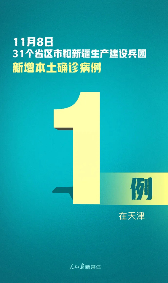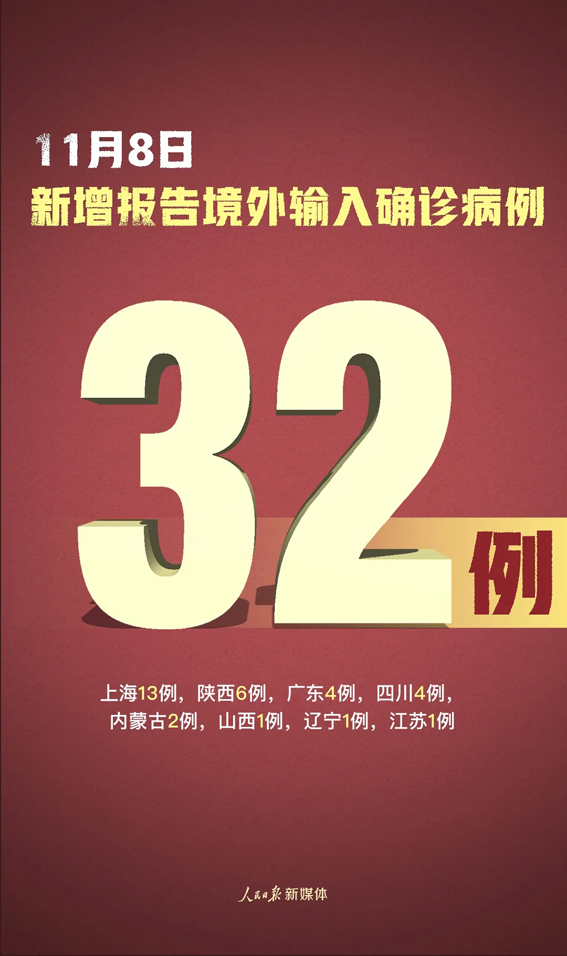11月8日0—24时,31个省(自治区、直辖市)和新疆生产建设兵团报告新增确诊病例33例,其中境外输入病例32例(上海13例,陕西6例,广东4例,四川4例,内蒙古2例,山西1例,辽宁1例,江苏1例),本土病例1例(在天津);无新增死亡病例;新增疑似病例1例,为境外输入病例(在上海)。