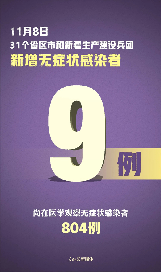 当日新增治愈出院病例19例,解除医学观察的密切接触者564人,重症病例较前一日增加1例。 境外输入现有确诊病例363例(其中重症病例2例),现有疑似病例5例。累计确诊病例3603例,累计治愈出院病例3240例,无死亡病例。 截至11月8日24时,据31个省(自治区、直辖市)和新疆生产建设兵团报告,现有确诊病例424例(其中重症病例8例),累计治愈出院病例81187例,累计死亡病例4634例,累计报告确诊病例86245例,现有疑似病例5例。累计追踪到密切接触者869505人,尚在医学观察的密切接触者16503人。 31个省(自治区、直辖市)和新疆生产建设兵团报告新增无症状感染者9例(均为境外输入);当日转为确诊病例1例(为境外输入);当日解除医学观察28例(境外输入19例);尚在医学观察无症状感染者804例(境外输入497例)。