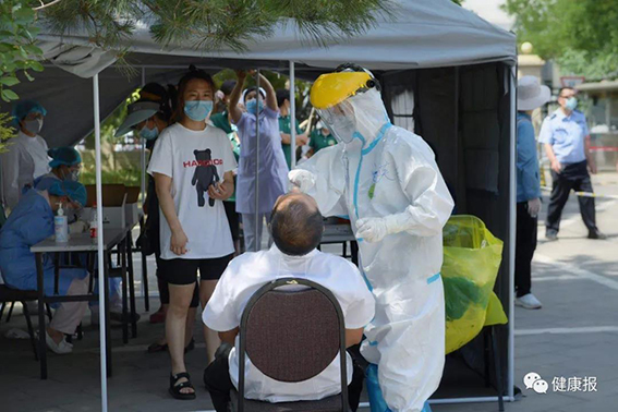 应检尽检:走过路过都能被“揪出来” 6月21日一早,北京市大兴区天宫院北里社区居民杨斌(化名)在朋友圈中晒出了自己的核酸检测阴性报告。用他的话说,经历了4天的“闭关”,终于“修成正果”。 “我是16日接到检测通知的。”杨斌清晰地记得,那天是周二,早上正要出门,一条来自大兴区新冠肺炎防控领导小组办公室的短信打断了行程:经过全市大数据分析,您可能在5月30日(含)以后去过新发地批发市场。根据北京市防疫工作要求,您即刻起停止外出,并立即配合填报信息,如果不如实填写,将负法律责任。镇、街道等属地将会与您联系,安排做核酸检测。另外,从今晚起可能有相关工作人员跟您联系,请积极配合。 突如其来的短信让杨斌开始回忆自己近期的活动轨迹,想来想去,没去过新发地市场啊。“想破脑袋,归纳了两种可能:一是每天上班坐四号线,会途径新发地所在的商圈;二是前段时间去过西红门附近的家居市场,离新发地不远。”走过路过没进去过,都能被“揪出来”,杨斌忍不住感慨,大数据加持下的防控网恢恢,密而不漏。当天下午,杨斌就填写了未去过新发地市场的《个人承诺书》。 第二天上午,社区工作人员和区疾控中心分别打来电话,通知杨斌已为他预约好当天下午进行核酸检测。 下午两点,杨斌按时来到指定的检测采样点——清华大学附属中学大兴学校,现场有社区工作人员和安保人员维持秩序。杨斌在工作人员指示下,通过扫二维码录入个人信息。此后,他拿到一个标注“细胞保存液”并有检测样本编号的小瓶子。“我看网上都是医务人员操作取样的,我们却是自助取样。”杨斌说,坐在椅子上后,医务人员给了他一根长长的棉签,并指导他将棉签伸入咽喉里,“自己捅,总归有点下不去手,弄了好几次才成功,也算是种特殊的经历吧。最终结果是好的”。 就在杨斌接到检测通知的同一天,记者的一位医生朋友也在微信朋友圈表示,当天接到通知说他曾去过新发地,“仔细想了一下是在高速上路过,我看了新发地一眼,新发地也‘看’到了我。为了让政府放心、让人民放心,中午顶着太阳排了3次队,经过一个小时的等待,做了免费的核酸检测。”这位朋友表示,平时是给患者做检测,这次体验了被检测的过程,换位的经历让他感触良多。