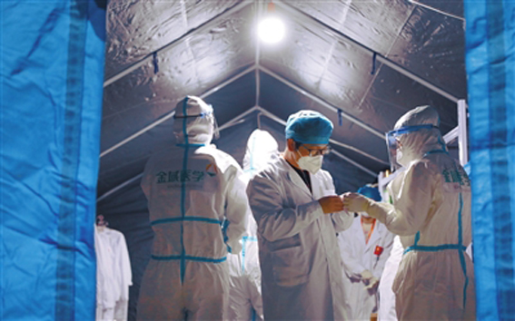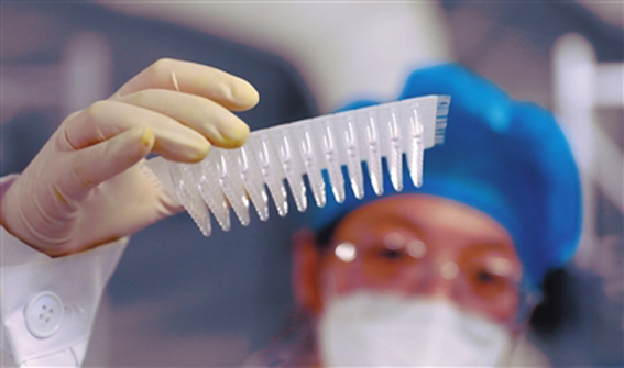 大连硬气膜实验室工作人员观看核酸检测样本。