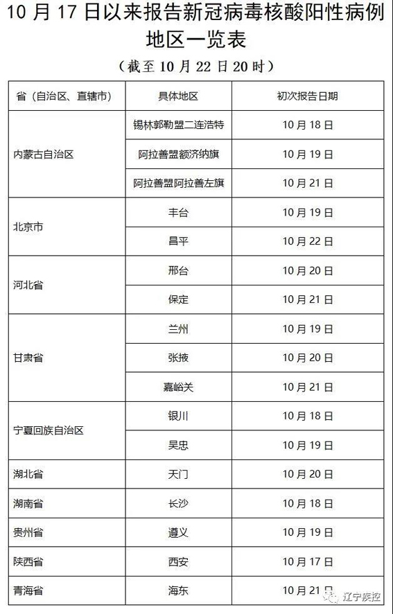 自10月17日本轮新冠肺炎疫情发生以来,已波及10省17市,目前全国共有1个高风险地区、9个中风险地区,4天时间累计发现阳性感染者70余例。本轮新冠肺炎疫情存在一定的复杂性和不确定性,感染来源尚不明确,蔓延速度快,形势严峻。辽宁省疾控中心提醒广大居民:一、非必要不离辽。近期非必要不出省,特别是不去中高风险地区和报告阳性病例的地区。二、主动核酸检测。由外省来(返)辽后,建议第一时间做一次核酸检测,并做好14天自我健康监测,尽量减少外出。倡导国庆假期以来由外省来(返)辽人员主动做一次核酸检测。三、减少聚集和出游。冬季来临,病毒存活时间长,通风条件差,利于病毒传播,要坚持不扎堆、少聚集。建议近期避免举办、参加各种聚集性活动,家庭私人聚会控制人数和时长。减少跨地区旅游,减少在人群密集场所停留时间。四、尽早接种疫苗。当前我省绝大多数人完成了新冠疫苗接种,请符合条件尚未接种、未完成全程接种或符合加强免疫接种条件的,及早进行免疫接种。五、主动报备报告。请随时关注疫情变化,以及新闻媒体、官方网站、政务新媒体发布的新发病例轨迹。从发生疫情地区来(返)辽以及与病例行程轨迹有交集的,要主动向社区(村)、所在单位或住宿酒店报备报告,积极配合落实相关疫情防控措施,积极主动进行核酸检测。六、做好个人防护。保持疫情防控意识,自觉落实常态化疫情防控措施,坚持科学规范佩戴口罩,勤洗手,常通风,少聚集,用公筷。出入公共场所自觉遵守扫码、测温、戴口罩等各项疫情防控要求。近日,国内多地通报本土确诊病例及无症状感染者,疫情外溢波及多个省市,疫情防控形势严峻复杂。10月21日,为严格落实“外防输入、内防反弹”的防控策略,有效控制和降低疫情传播风险,沈阳市疾控中心向市民发出提醒,广大市民要始终绷紧疫情防控这根弦,域外返沈最好进行核酸检测。