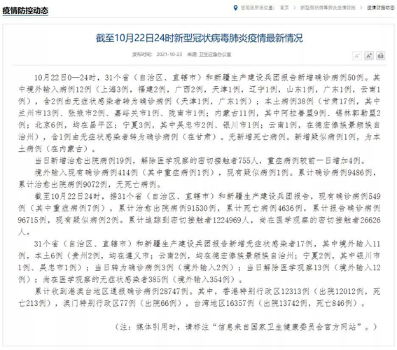 10月22日0—24时,31个省(自治区、直辖市)和新疆生产建设兵团报告新增确诊病例50例。其中境外输入病例12例(上海3例,福建2例,广西2例,天津1例,辽宁1例,山东1例,广东1例,云南1例),含2例由无症状感染者转为确诊病例(天津1例,广东1例);本土病例38例(甘肃17例,其中兰州市13例、张掖市2例、嘉峪关市1例、陇南市1例;内蒙古11例,其中阿拉善盟9例、锡林郭勒盟2例;北京6例,均在昌平区;宁夏3例,其中吴忠市2例、银川市1例;云南1例,在德宏傣族景颇族自治州),含1例由无症状感染者转为确诊病例(在甘肃)。无新增死亡病例。新增疑似病例1例,为本土病例(在内蒙古)。当日新增治愈出院病例19例,解除医学观察的密切接触者755人,重症病例较前一日增加4例。境外输入现有确诊病例414例(其中重症病例1例),现有疑似病例1例。累计确诊病例9486例,累计治愈出院病例9072例,无死亡病例。截至10月22日24时,据31个省(自治区、直辖市)和新疆生产建设兵团报告,现有确诊病例549例(其中重症病例7例),累计治愈出院病例91530例,累计死亡病例4636例,累计报告确诊病例96715例,现有疑似病例2例。累计追踪到密切接触者1224969人,尚在医学观察的密切接触者26626人。31个省(自治区、直辖市)和新疆生产建设兵团报告新增无症状感染者17例,其中境外输入11例,本土6例(贵州2例,均在遵义市;云南2例,均在德宏傣族景颇族自治州;宁夏2例,其中银川市1例、吴忠市1例);当日转为确诊病例3例(境外输入2例);当日解除医学观察13例(境外输入12例);尚在医学观察的无症状感染者385例(境外输入354例)。累计收到港澳台地区通报确诊病例28747例。其中,香港特别行政区12313例(出院12012例,死亡213例),澳门特别行政区77例(出院66例),台湾地区16357例(出院13742例,死亡846例)。
