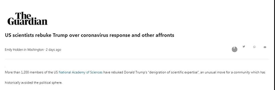 在美国新冠肺炎疫情严峻形势之下,公开信很快得到了美国国家科学院1220名科学家成员的签名。在公开信里,科学家们要求美国政府在对公众开放的网站上要有科学方面内容信息,要任命专业人士从事对科学专业知识背景要求的政府岗位。共同发起这封公开信的美国科学家表示,这封公开信的目的是为了让政府的政策决策回归科学性。在美国科学界看来,美国政府一直对新冠肺炎疫情无所作为,同时无视专家的建议,其中包括要求全民戴口罩以及将未经试验证明药物用于治疗新冠肺炎等。