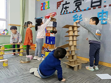 搭建地点的改变让幼儿拥有了更大的空间,作品自然就会向高处发展。在户外建构游戏中,通过合作、分工、动手搭建等,给孩子们提供了解决问题的机会和思考的空间。建构游戏的开展过程是一个不断实践、不断积累、不断思考的过程。既充分满足了孩子们热爱游戏的天性,又让孩子们在现实环境中学会协商、谦让、分享、合作,体验挫折和成功,从而实现了合作能力的提升以及个性的和谐发展。