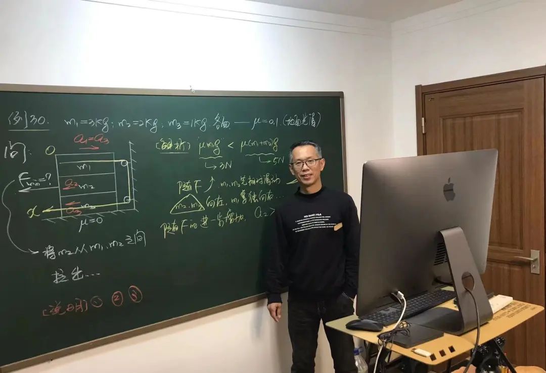 “跟真实的课堂相比,网课的亲切感要差很多。师生隔着屏幕,缺乏交流。”陈昕若所说的“交流”,其中就包括写黑板板书的过程。“在电子屏幕上直接推送板书,没有书写过程,很难吸引学生的注意力。”为了更真实地还原课堂氛围,在今年春天那一阶段的网课中,陈昕若便找到一块跟学校教室里一样的绿黑板,费了很大劲,挂在了家里一间小卧室的空白墙上。“而且科学证实,绿色对视力也能起到保护作用。”这一挂,就是大半年。 网课期间,陈昕若将电脑摄像头满屏对准这块长2米、宽1米的黑板,自己则像在教室一样站着讲解和书写。由于黑板的面积有限,又无法像教室的一样推拉,他每堂课都要擦两三次。“一开始,粉笔灰飘得到处都是,后来我干脆准备几块湿抹布,每次连擦两遍,效果还不错。”陈昕若说。 “物理学科的学习,就是学生体会、理解、生成的过程。”作为沈阳二中高一院士班的物理教师,从教二十多年的陈昕若对课堂教学和板书书写有着深刻的理解,“课堂上,学生看老师写板书其实就是思考的过程,有时老师修改笔误也是与学生间思维交流的过程。” 在陈昕若看来,写板书不仅不会浪费课堂时间,反而能大大提高课堂教学效率。而绘制物理学科常用的物体受力分析图、物体运动过程示意图,他更有自己的“独门秘籍”。比如,他会用左手拇指当圆心,借助一把尺做半径,瞬间画出一个圆;或者借助一根绳子和两块小磁铁,几秒勾勒出椭圆形;双曲线、抛物线也不在话下。“其实就是画得多总结出的经验。”陈昕若说,二中物理组的老师们经常会交流,几何图形怎样画表现力更强,如何既快又好看地画出物块、弹簧、小车、跑步中的人……