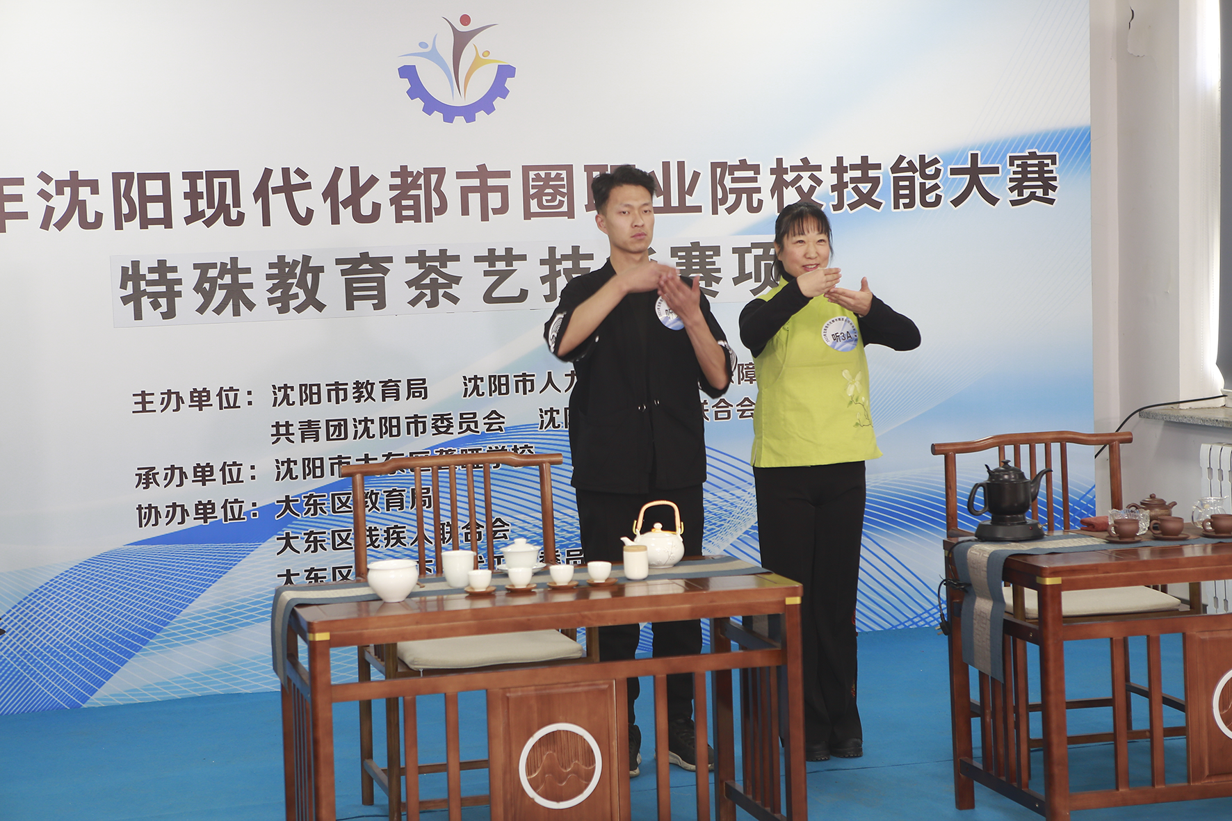 2023年沈阳现代化都市圈职业院校技能大赛特殊教育组茶艺比赛师生同赛,参赛选手对自创茶艺作品进行手语解说。