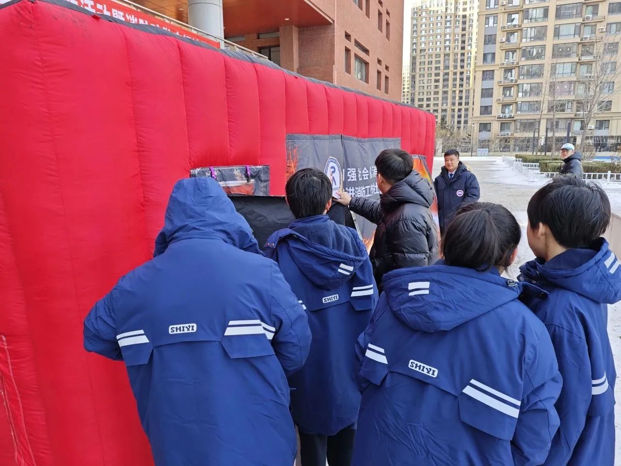 首先,辽宁省消防协会科普委教官张旭进行了“预防为主,生命至上”的主题培训。培训会上,张旭教官讲解了消防安全知识、火灾的危害性及常用消防器材和标识,结合“事故图片”案例演示了校园火灾突发时逃生、自救、自我保护的正确方法及灭火器材的正确使用方法,要求师生要熟练掌握学校撤离路线及撤离后的安全区域。培训增强了师生自救防范、应对突发事件的技巧,进一步提高了师生消防安全意识。随后,浑南五中进行了食堂消防疏散演练和火灾模拟逃生演练,并邀请与会人员进行体验观摩。食堂后勤人员示范并操作了“油锅起火”后的正确操作,讲解了厨房内灭火毯等消防器材的正确使用方法和油锅起火后的灭火原理。通过室外VR火灾逃生帐篷模拟房间内起火后的真实场景,带领师生真正体验了一场“火场逃生”。师生在沉浸式体验中获得了消防安全知识,学会了消防安全技能,提升了自救、互救、自护的能力。