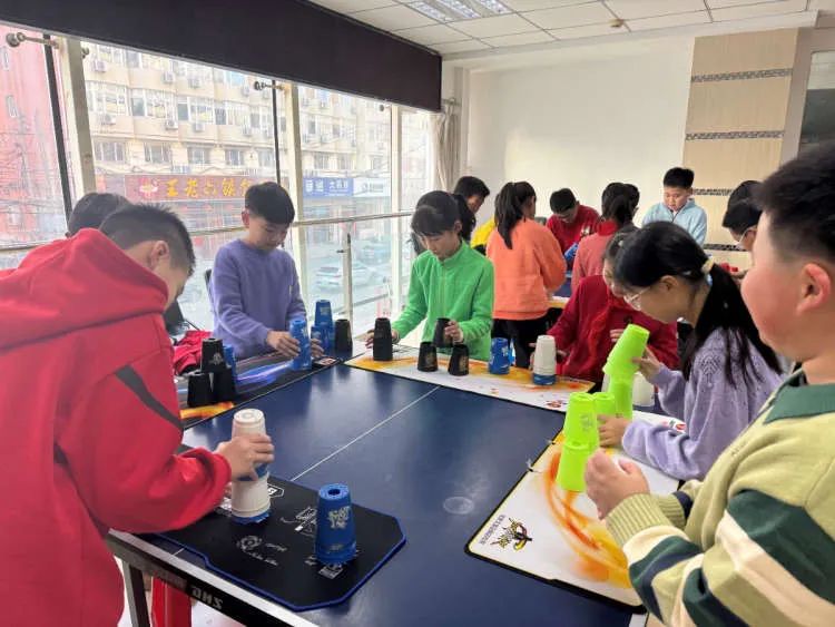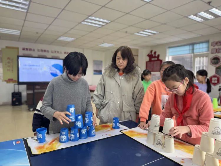 活动开始,李杰老师先向社区的孩子们介绍飞碟杯的玩法,和他们一起观看飞碟杯竞赛视频,引导社区的孩子们主动探索飞碟杯快速叠、收的方法。李杰老师对孩子们逐一进行指导,在一次次的尝试练习中,孩子们手眼协调、迅速反应,逐渐掌握快速叠、收飞碟杯的方法,体会到了科技活动的魅力。