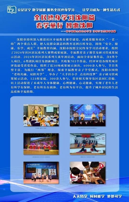 会前,沈阳市作为辽沈地区构建全民终身学习教育体系的主阵地,高度重视此次活动周工作,按照省厅工作要求,全面征集 2024年4月以来沈阳市各区县(市)社区教育和老年教育的视频、图片及文字素材,严格遵循“规范报送、质量优先”原则,为辽宁省活动周画册、展板及宣传片制作提供了优质内容支撑。