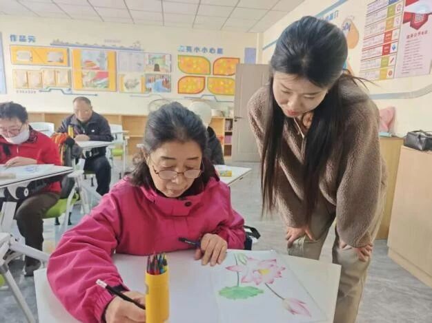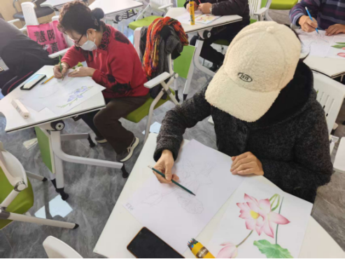 “这笔触轻一点,花瓣的层次感就出来了”“颜色叠加时别急,慢慢晕染更自然”,苏家屯区解放街道金山社区幸福教育课堂内,青松中学的叶老师正耐心指导学员们勾勒彩铅画细节。桌上的画纸上,娇艳的花卉在学员们的笔尖下渐显雏形,阵阵欢声笑语为课堂添满温馨。