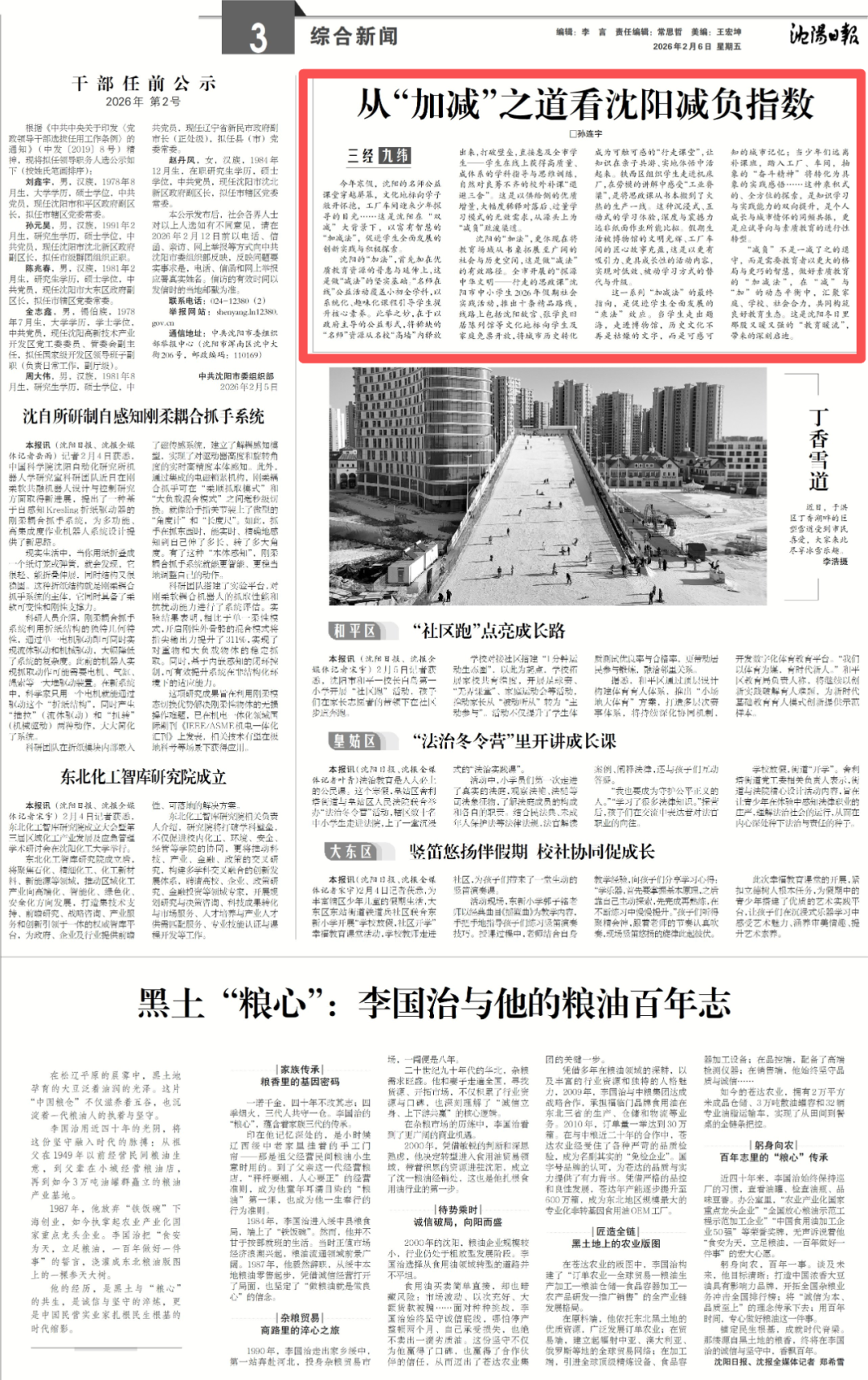 从“加减”之道看沈阳减负指数 沈阳日报、沈阳发布评论员 孙连宇 今年寒假,沈阳的名师公益课堂穿越屏幕,文化地标向学子敞开怀抱,工厂车间迎来少年探寻的目光……这是沈阳在“双减”大背景下,以富有智慧的“加减法”,促进学生全面发展的创新实践与积极探索。