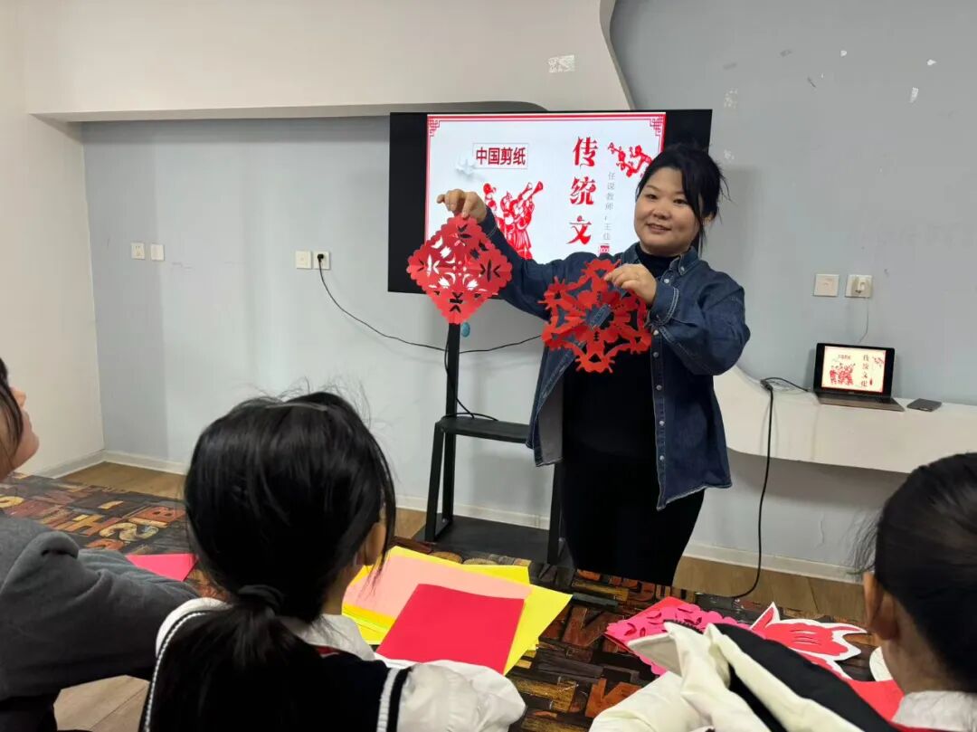 红纸间藏着文化密码 活动现场创意涌动,王佳老师以通俗好懂、充满趣味的教学方式,为社区孩子们带来沉浸式剪纸体验。教学中,王老师从红纸裁剪、基础纹样解读,到福字、窗花、生肖等新春主题图案的设计创作,一步步耐心示范、细致点拨,手把手纠正孩子们的剪刻手法,帮助大家快速找到技巧要领。孩子们兴致勃勃,手持剪刀专注投入,一张张普通的彩纸渐渐变成寓意吉祥的精美作品。一张张稚嫩脸庞洋溢着满满的成就感,一个个专注身影成为社区里最动人的风景,剪纸不仅锻炼了孩子们的动手能力与专注力,更让他们在亲身实践中领略到传统技艺的独特魅力与文化内涵。