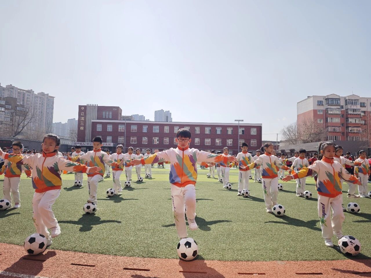 本次联赛以足篮双赛为核心,践行“健康第一”理念,是大东区深化体教融合、推动校园体育高质量发展的创新举措。仪式现场,开球仪式点燃激情,师生们带来的足球操、啦啦操展演精彩纷呈,校园活力四射。赛事覆盖两校区、多年级,设置多元赛制,让每一名孩子都能站上赛场。