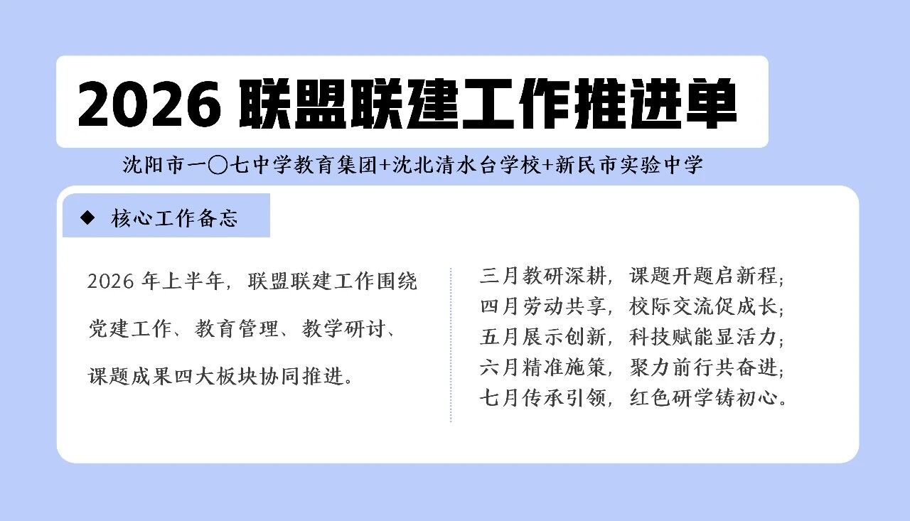 为深入推进沈阳市城乡义务教育优质均衡发展,沈阳市一〇七中学教育集团先后与沈北清水台学校、新民市实验中学缔结城乡教育联盟。从初春的联合教研到盛夏的红色研学,从AI赋能的智慧课堂到城乡同频的成长支持,三所学校坚持“理念共享、方法共研、质量共进、资源互通”,累计开展活动30余场,覆盖全学科教学、教师发展、智慧教育等七大领域,让优质教育的春风吹进每一间教室。 顶层设计:一张清单览全年 联盟不是挂牌子,而是钉钉子。作为主体校,沈阳市一〇七中学教育集团把联盟共建纳入年度重点任务,为两所联盟校量身定制“年度共建清单”,细化到科、责任到人。2026年春季,一张“联盟联建月度推进图”格外清晰:3月课题研讨与教研深耕,4月共享劳动教育经验,5月开展项目化学习展示与科技节交流,6月聚焦AI赋能教学与心理健康指导,7月系统推进青蓝工程与党建活动……系统化的安排让每月有主题、每周有互动,确保联盟工作不走形式、见到实效。