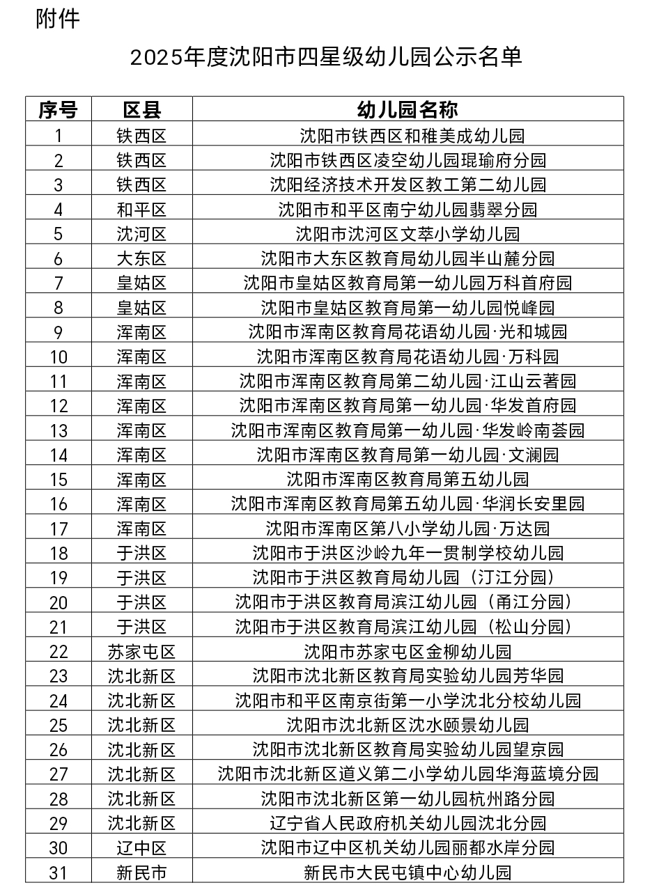 根据《辽宁省教育厅等3部门关于印发<辽宁省幼儿园评估定级标准(2023年修订)>的通知》《沈阳市教育局沈阳市卫计委关于进一步做好幼儿园评估定级工作的通知》《沈阳市教育局关于破格晋升四星级以上幼儿园申报条件的通知》要求,经幼儿园自评、区县初评、市教育和卫生部门组成专家组联合评定,拟认定沈阳市铁西区和稚美成幼儿园等31所幼儿园为“沈阳市四星级幼儿园”,现予以公示(名单见附件)。公示期为2025年9月29日至10月5日。 各单位或个人如有异议,请在2025年10月5日前以书面方式向市教育局学前教育处反映。书面材料须写明异议的详细内容和理由。个人提出异议须真实署名,明确联系方式;单位提出异议需署真实单位名称,加盖公章,并明确联系人和联系方式。信函的有效时间以发信时当地邮戳为准。 联系电话:024-22717964-3 通信地址:沈阳市教育局学前教育处(沈阳市沈河区北二经街55号 邮政编码:110014) 附件:2025年度沈阳市四星级幼儿园公示名单 沈阳市教育局 2025年9月29日 |